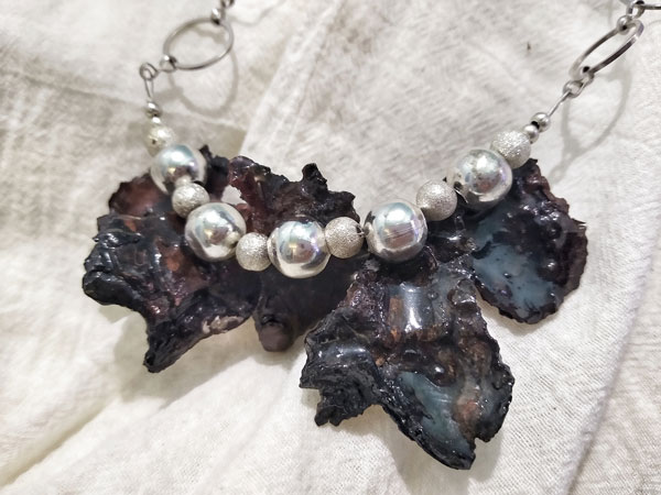 Gargantilla ensamble metal inoxidable en aros ovalados, piezas esféricas de dos tamaños y texturas, resaltando las piezas principales de corteza de árbol.