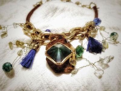 Gargantilla pieza de maguey con ensamble de cristal cuadrado en color verde, con forma piramidal, montado en cadena color dorada de acero en eslabón grande, motas azules de hilo, cuentas de cristal y varias en color verde y azul, sujetas de pieza circular gruesa de cuero con terminación cadena de eslabón grande de aluminio.