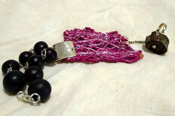 Semillas de jojoba enlazadas, auna pieza de plata trabajo realizado en Taxco, conjuntan una pieza rosa con plateado de nopal, y esta enlaza con una cadena de acero inoxidable un anillo, de pieza de tronco.